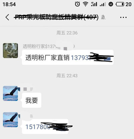 (采光瓦群里出售透明粉的廣告)