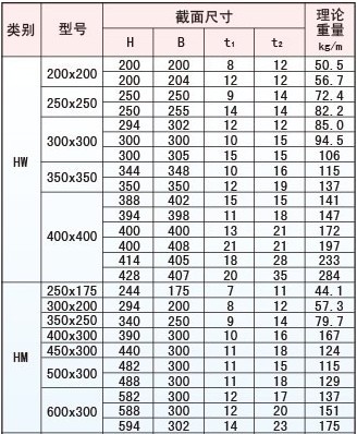 (表中字母代表含義為 —— H:高度、B:寬度、t1:腹板厚度,t2:翼緣厚度)